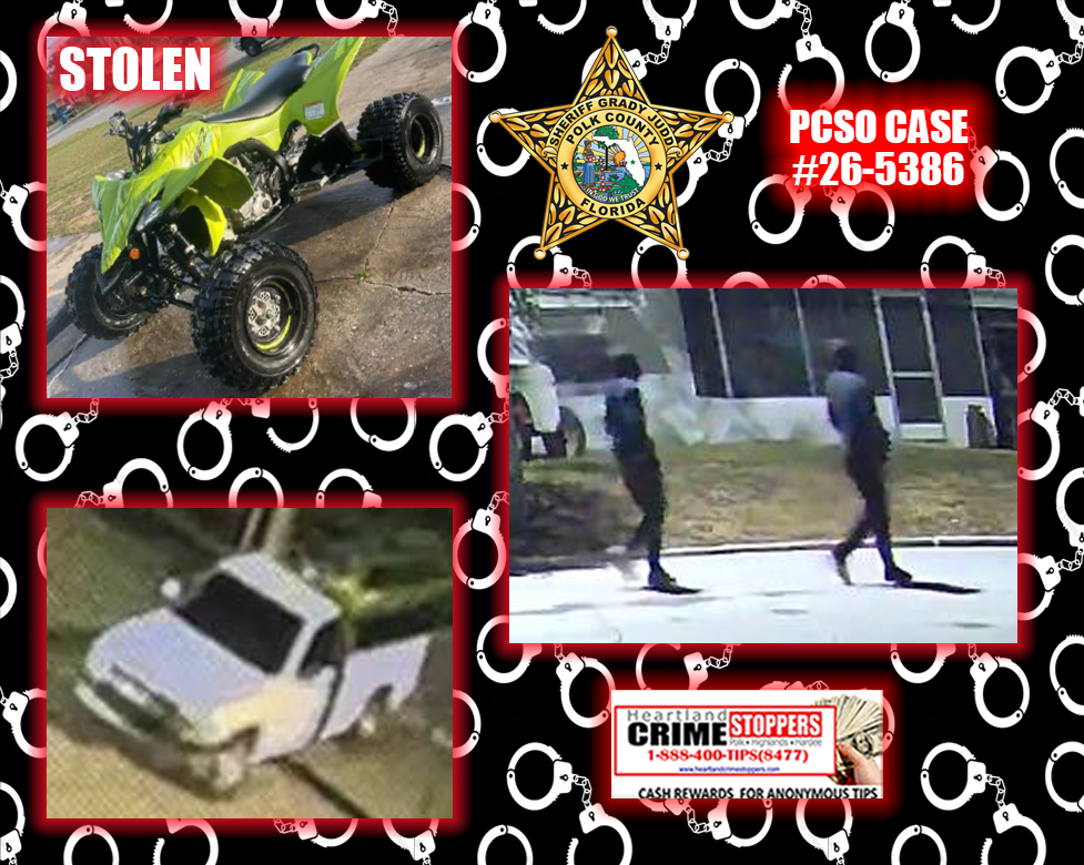 On February 6, 2026, at around 11:30 pm, a lime green Yamaha ATV was stolen from a carport on Wall Street West in Frostproof.