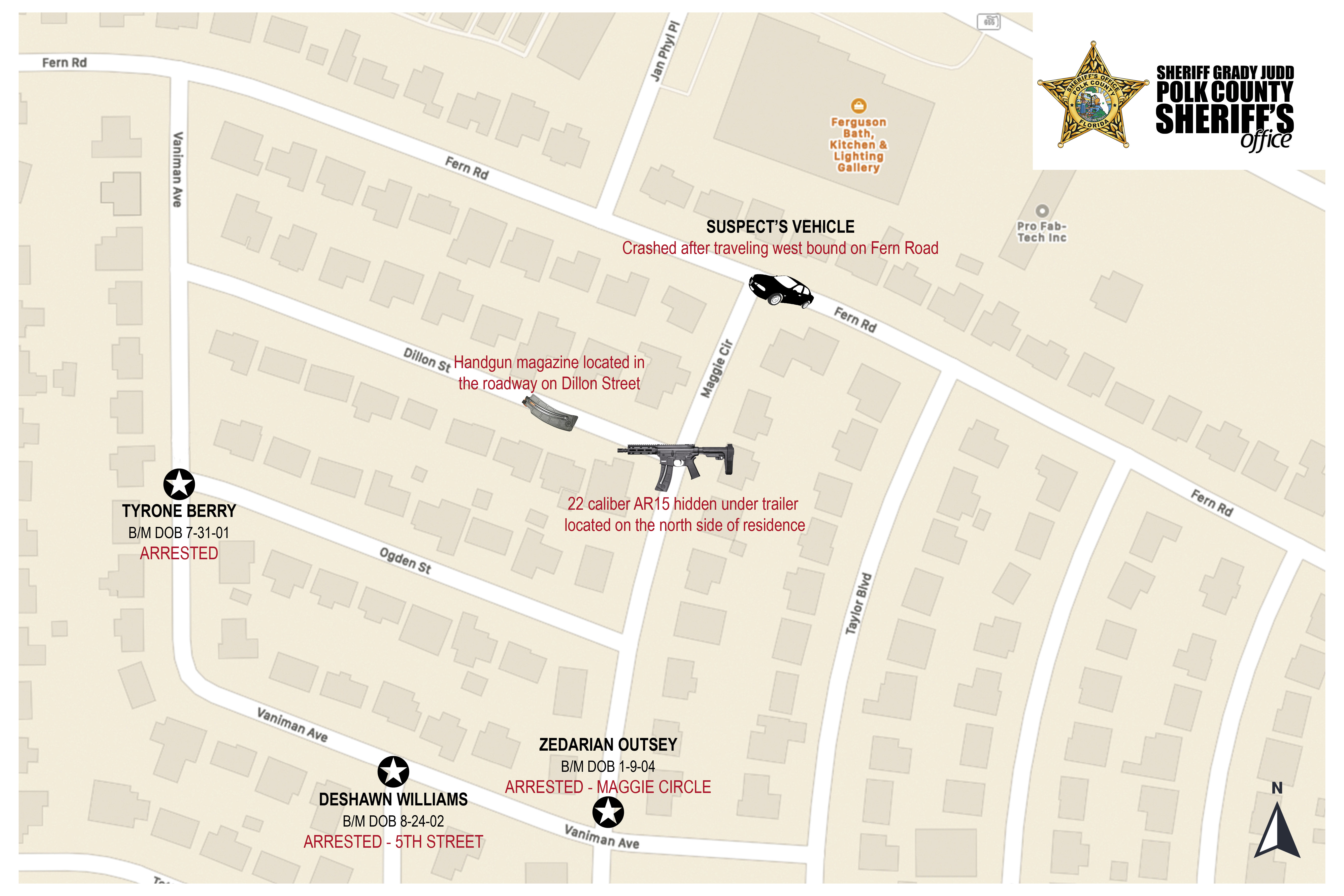 On Wednesday, May 26, 2021, PCSO detectives arrested 19-year-old Tyrone Berry of Haines City, 17-year-old Zedarian Outsey of Haines City, and 18-year-old Deshawn Williams of Winter Haven for attempted murder and other charges stemming from a drive-by shooting that occurred near Fern Road and Maggie Circle in unincorporated Winter Haven the same day. Click here to watch the news conference.